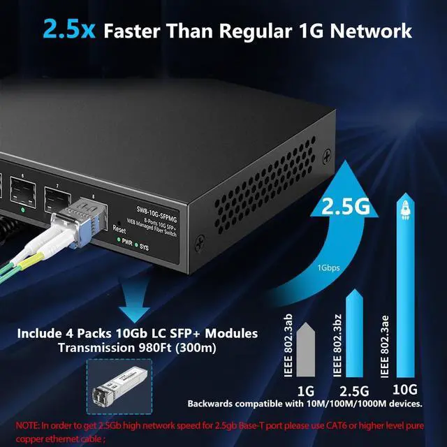 10G SFP+ LC Module10GBASE-SR SFP+ to LC Optical 10 Gigabit Fiber transceiver module, 10Gbe Multimode SFP+(compatible with both 62.5um and 50um LC cables; supports OM1/OM2/OM3/OM4 fiber cables), Duplex LC connector, 850nm, DDM, up to 300m.