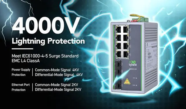 Lightning Protection InHand ISM5012D provides high-quality industrial protection with a wide operating temperature, -40~+85, so it can operate stably for a long time at high and low temperatures. It meets EMC level 4 standard and IP40 protection against harsh weather like thunderstorms.