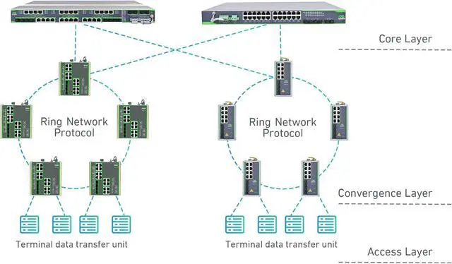 Multiple Ring Network Protocol ISM5012D is compatible with major brands of switches. It connects other devices through STP/RSTP/MSTP/ERPS/EAPS protocol. RSTP is enabled by default. Support single ring, double ring, tangent ring, and cross ring.
