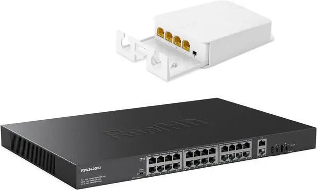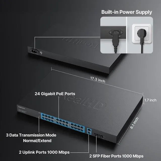 • PLUG AND PLAY24 x gigabit PoE ports and 2* 1G RJ45 ports+2 *1G SFP ports unmanaged PoE switch, easy setup with no software installation or configuration needed. Does not have IP address or web interface.