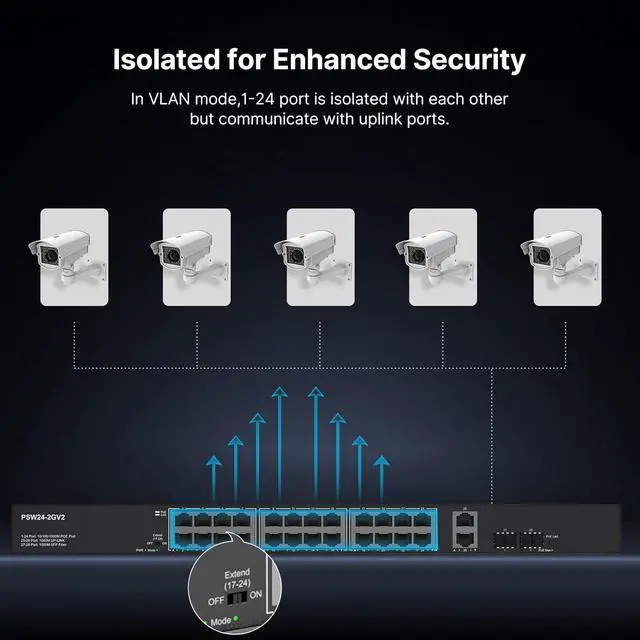 STANDARD POE SWITCHPD Detection, Automatically detect and provide required power for your PoE devices and protect your non-PoE equipment from being damaged. PoE Extension data transmission up to 600ft long distance if needed (Transmission Speed will be reduced to 10Mbps if extend function is operating, must use high quality cable)