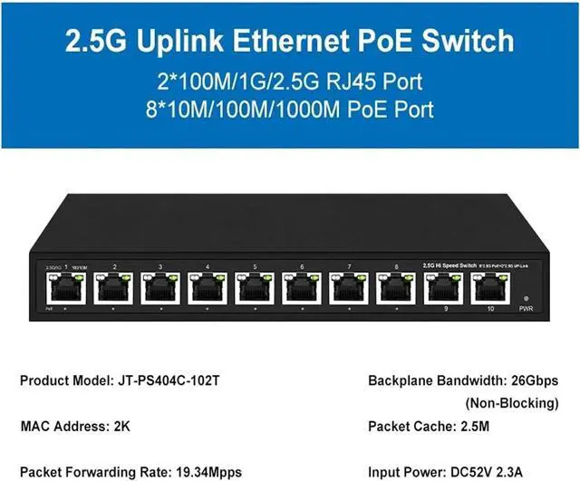 2.5G PoE Ethernet Switch,JT-PS404C-62T/JT-PS404C-102T 4/8*10/100/1000M PoE Ports Slot 100W 2*2.5G RJ45(JT-PS404C-102T)