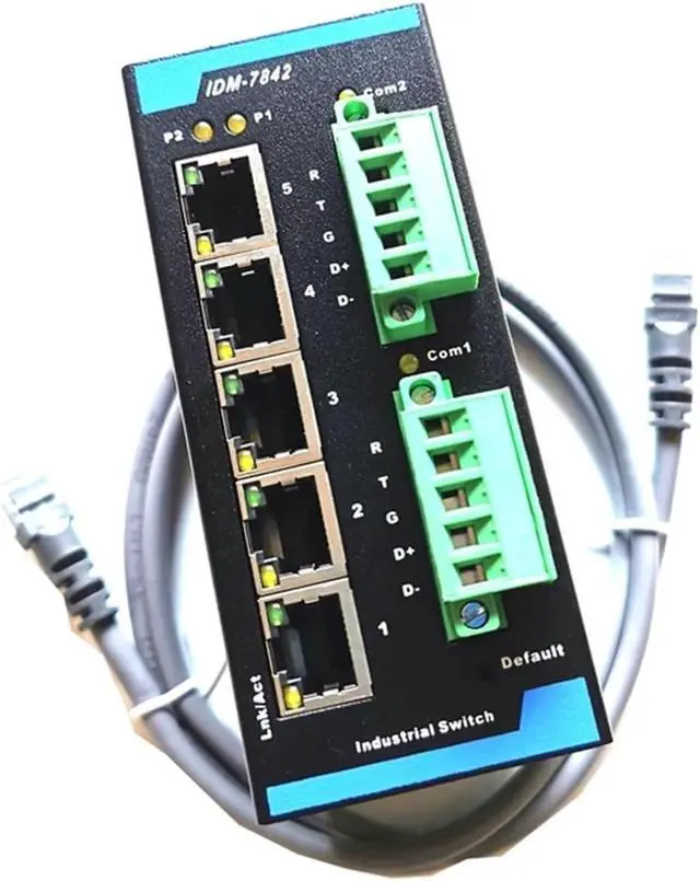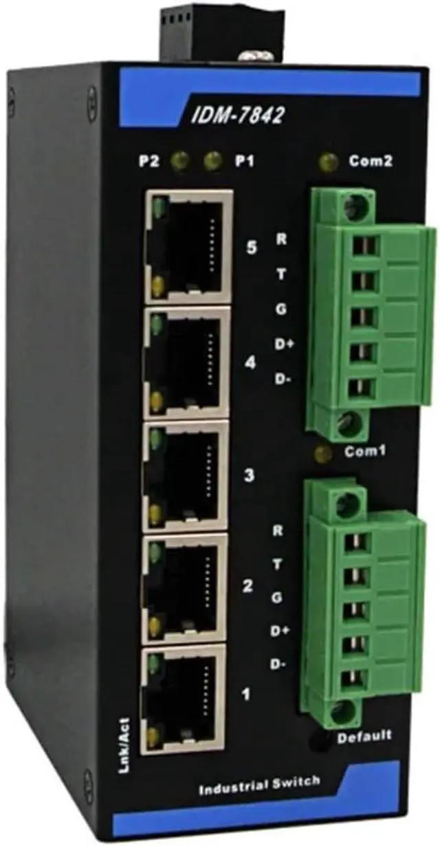 The IDM-7842MG is a multi-port isolated Modbus gateway device that integrates a 5-port 10/100M switch and 2
