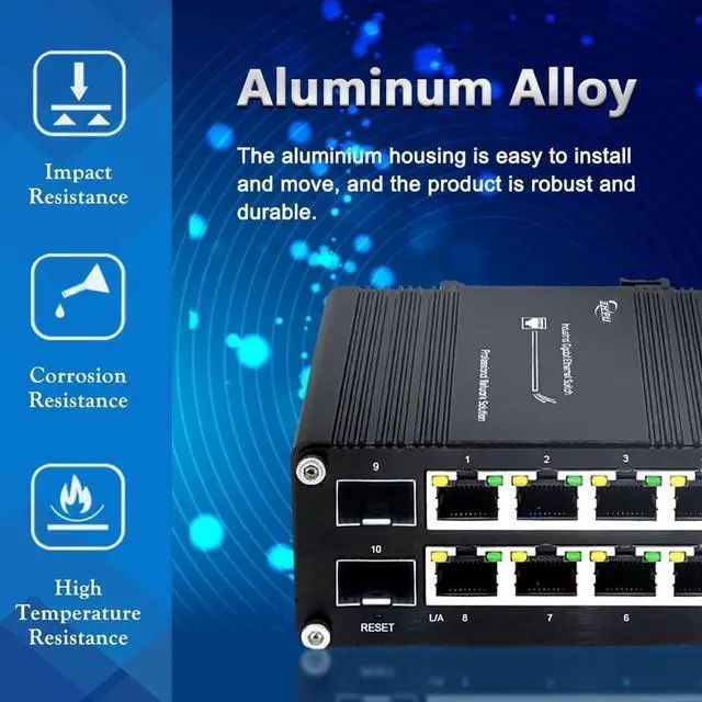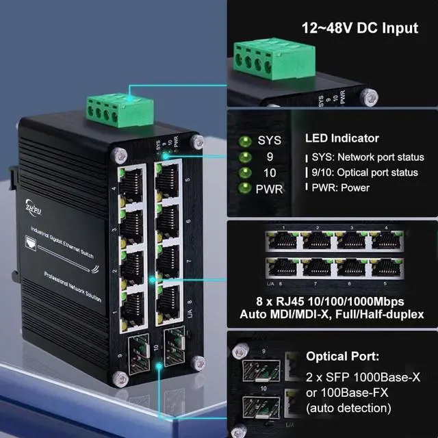 Flexible Port Configuration: Features 8x 10/100/1000Mbps RJ45 ports that auto-negotiate speed and support Auto MDI/MDIX, plus 2x 100/1000Base-X SFP slots for fiber optic connectivity.