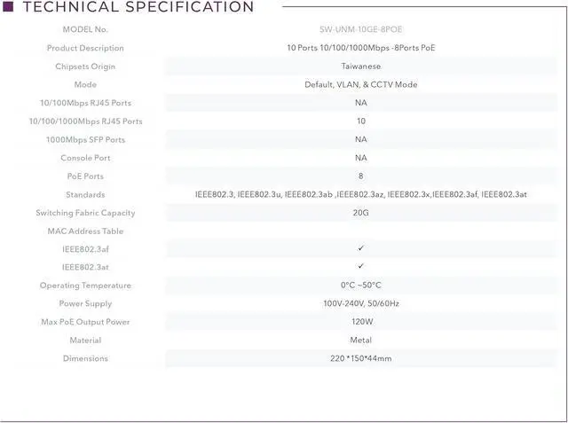 Port Features: Supports auto-negotiation and auto MDI/MDIX. | Switching Features: Utilizes the store-and-forward switching method. | Offers full-duplex flow control and half-duplex backpressure. | Employs MAC address auto-learning and auto-aging. | LED Indicators: Includes LED indicators for monitoring power, link/activity, and speed. | Ease of Use: Operates as an unmanaged device, making it a plug-and-play solution.