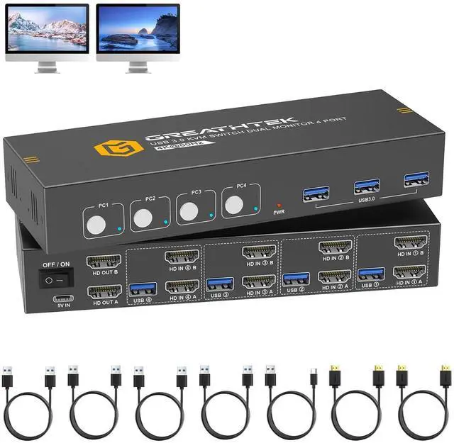 [USB3.0 KVM Switch 4 Computers 2 Monitors] This dual monitor HDMl KVM Switch 4 port supports 4computers sharing 2 monitors and USB3.0 devices. 1 set of keyboard and mouse management for 4computers, saving your desktop space and connecting work and personal computers for easy use. 2monitors can output either extended mode or copy mode. Kind reminder: Your computer needs to supportdual display function.