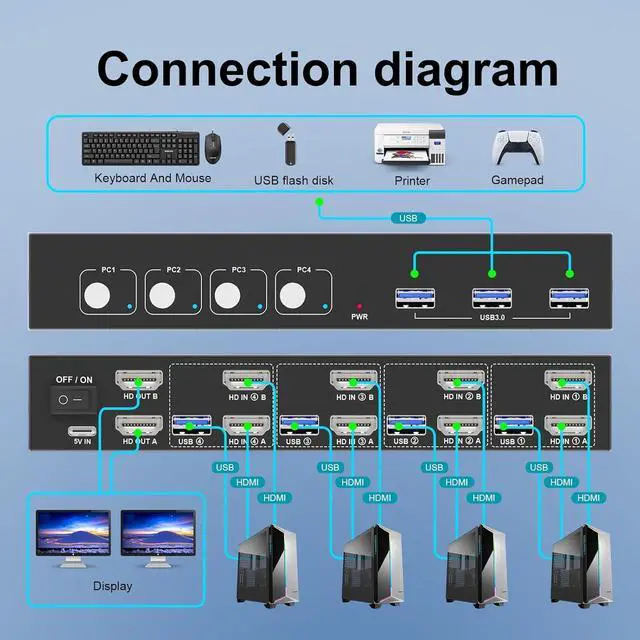 [Equipped with 3 USB 3.0 Ports] HDMl KVM switch 2 monitors 4 computers comes with 3 UsB 3.0 ports for4 computers to share USB devices such as keyboards, mouse, printers, UsB drives, etc. This KVM switchsupports multiple signal sources, such as PCs, laptops, PS4, and more. Compatible with various computesystems such as Windows 7/8/10/Vista/xp, Linux, Mac, etc. No driver required, plug and play