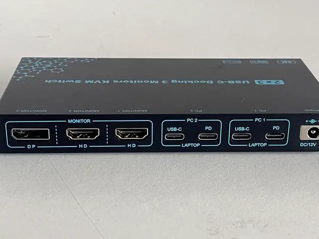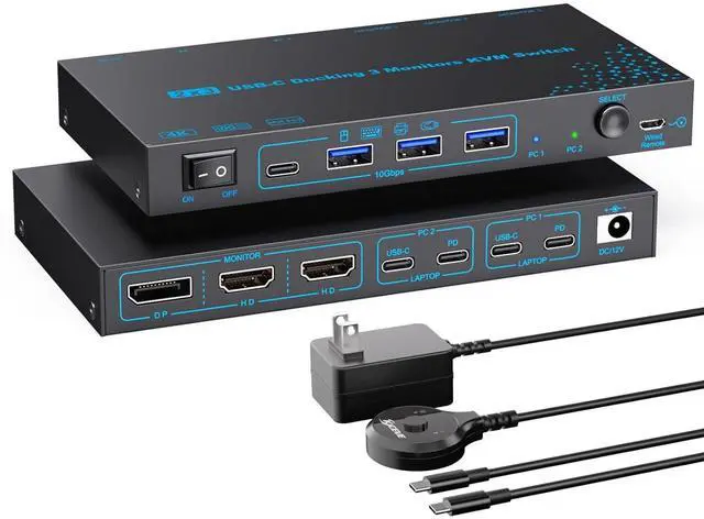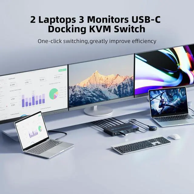 2 Laptops 3 Monitors USB-C Docking KVM Switch The 3 monitors 2 laptops MST dual USB-C docking KVM switch acts as a powerful USB-C docking station and a 3 monitors 2 computers KVM switches! While expanding your USB-C laptop into three external monitors (2* HDMI & 1*DP) and 4 USB3.0 Hubs, it also allows you to easily switch between 2 laptops to share 3 monitors and four 10Gbps USB peripherals. Save money, simplify your setup, and boost productivity with a clean, organized workspace
