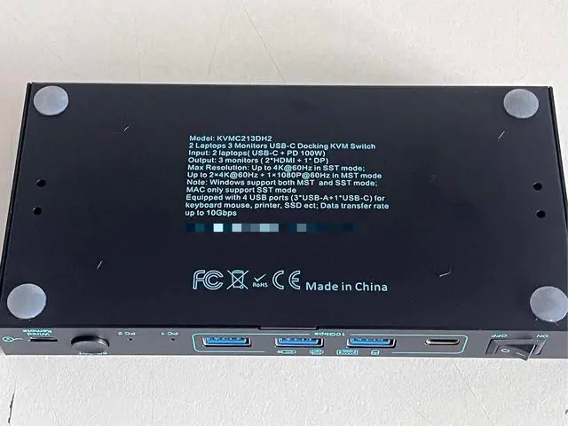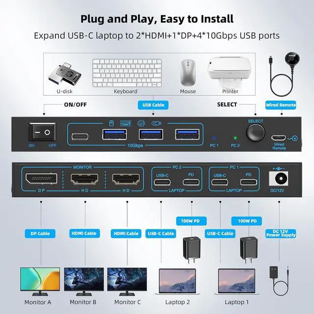 SuperSpeed 10Gbps Stable Data TransferThe MST 2 port USB Type C 2 computers kvm switch docking has 4 USB 3.1 Gen2 ports for connecting keyboard, mouse, printer, external hard drives, USB flash drives, and more. High performance USB 3.1 Gen2 chip supports blazing-fast transfer rate of 10Gbps, providing superior speed and stability than USB3.0. : For more stable operation, please plug the included 12V/1A power adapter into DC/12V port