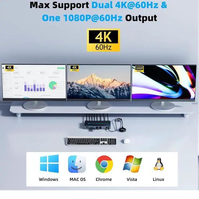 Wide Compatibility & Flexible Switching WaysThe 2 laptops 3 monitors Type-C docking KVM switch works smoothly with Windows, macOS, Linux, and Chrome OS. The switching method is very flexible, you can easily switch the signal between the 2 laptops in seconds through the Panel Button & Wired Remote Controller, clear LED indicators show the active computer