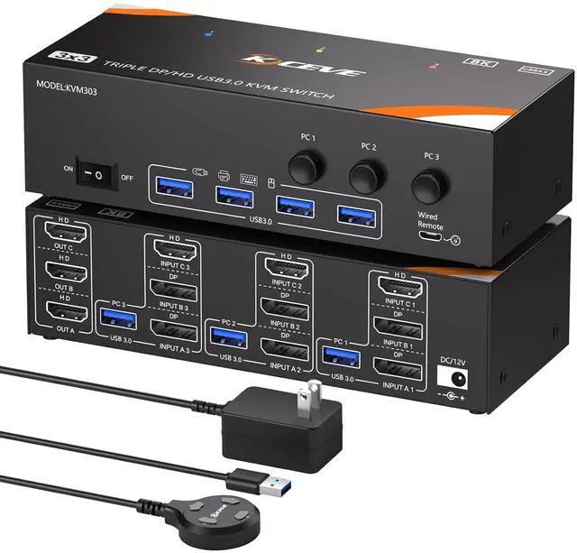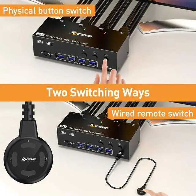 Ultra HD 8K Visual EffectThis HDMI Displayport KVM switch 3 port supports Ultra HD resolutions up to 8K@60Hz, with backward compatibility for 4K@144Hz, 4K@120Hz, and 1080P@240Hzdelivering stunning visuals with lifelike imagery and vibrant colors. (Note:To achieve the highest resolution, ensure that the signal source, HDMI cable, and DP cable all support 8K@60Hz )