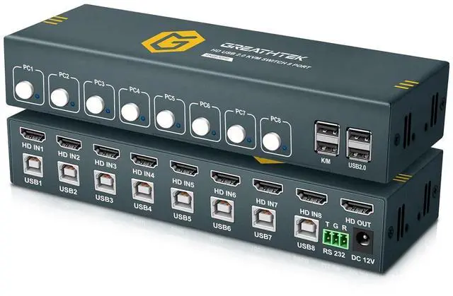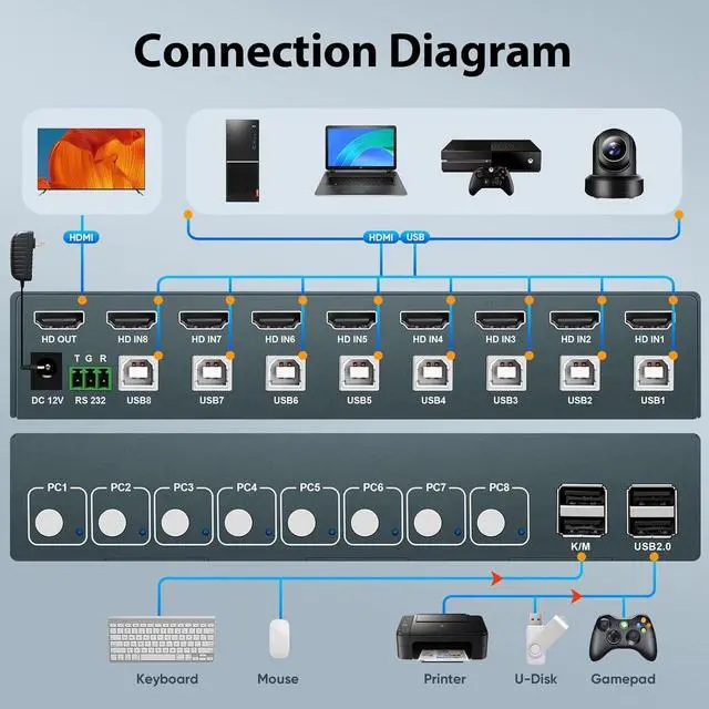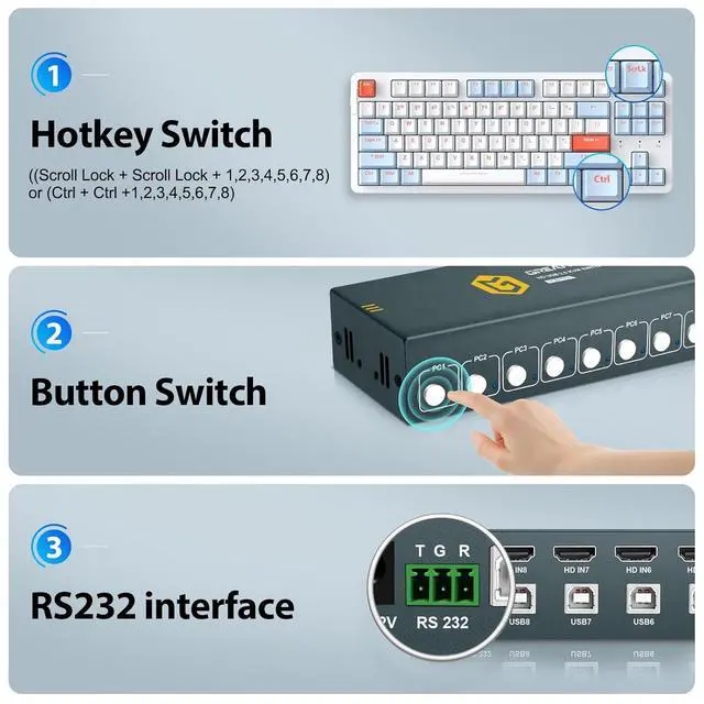 3 Switching Methods The KVM switch 8 computers supports 3 switching methods, including button switching, hotkey switching (keyboard switching), and RS232 commands. You can quickly switch between 8 computers at any time, which is simple and convenient. Please note that the keyboard and mouse are connected to the K/M port to support hotkey switching. If you need the RS232 command, please contact us through Amazon.