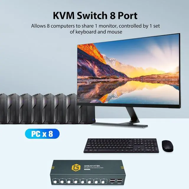 HDMI KVM Switch 8 PortThe 8 Port KVM Switch HDMI allows 8 computers to share 1 monitor, keyboard, and mouse. You can freely choose to control 8 computers, making it easy to manage both work and personal computers. This KVM Switch is suitable for various usage scenarios, greatly saving space occupied by the device.
