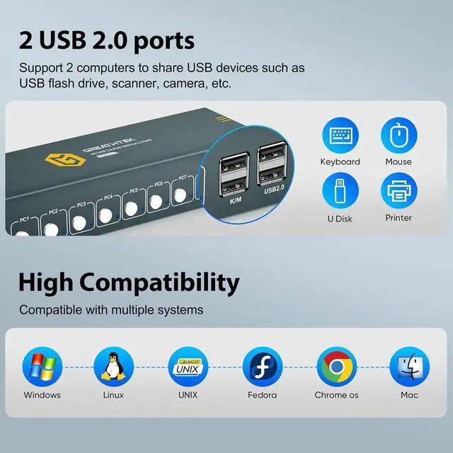 USB2.0 ports & Adaptive EDID The KVM switches comes with USB 2.0 ports for 8 computers to share USB devices such as scanners, USB drives, etc. KVM switch 8 port adaptive EDID, widely compatible with various systems such as Windows, Mac, Linux, etc. No driver required, plug and play.