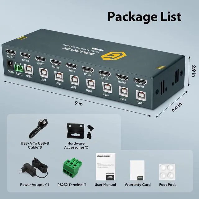 After Sales Team This HDMI KVM switch comes with 8 USB-B cables, 1 power adapter, and 1 RS232 terminal. If you have any questions about our products, please contact us directly through Amazon and we will resolve them for you as soon as possible.