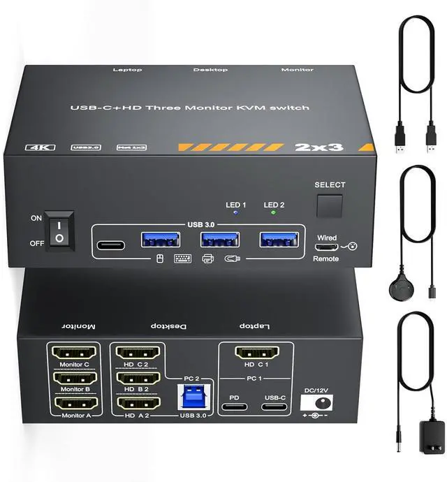 KVM Switch: 3 Monitors for 1 Desktop &1 LaptopThis KVM switch enables control of 2 computers with 3 monitors through a HDMI/USB C matrix. It also allows shared use of 3 USB 3.0 devices (such as keyboards, mouse, printers, and cameras) and 1 USB C port via a single hubcutting down on desktop clutter while increasing multitasking efficiency by 20%.