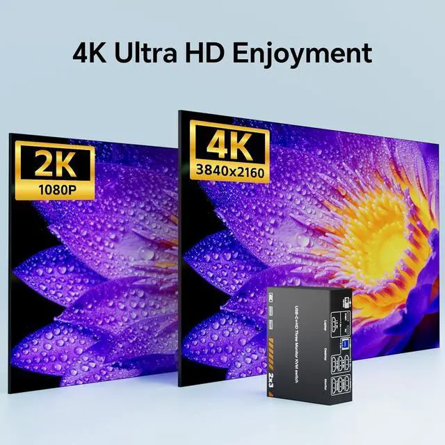 Support for High Resolution & High Refresh RateThis KVM switch supports resolutions and refresh rates up to 4K@60Hz/30Hz. Tip: For an optimal experience, use HDMI 2.1 and USB C cables. When distance permits, shorter cables are preferred for better performance.