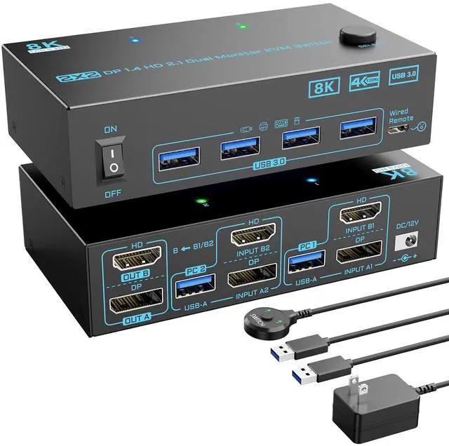 [5Gbps USB 3.0 DP 1.4 HDMI 2.1 KVM Switch]: 2 port 2 monitors 2 computers KVM switch equipped with 4 USB 3.0 ports for connecting peripherals such as keyboard, mouse, scanner, printer, USB camera, and hard drive ect. 5Gbps transfer rate is faster and more stable than USB 2.0. Please connect the USB cable from each PC to power the 8K KVM and transfer the USB data