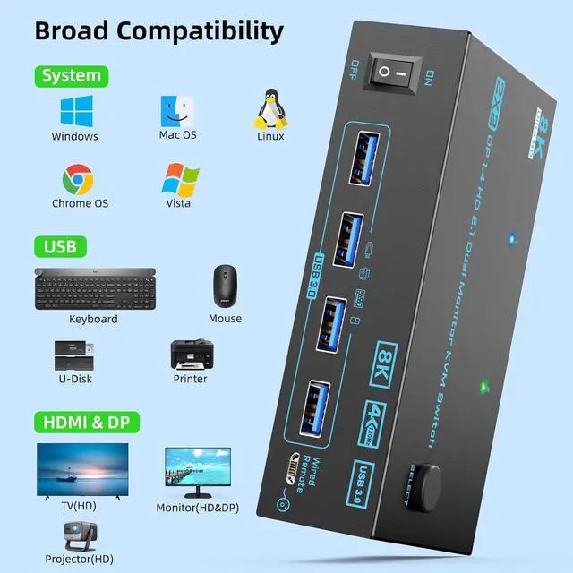 [Wide Compatibility & 2 Switching Ways]: 8K KVM switch is highly compatible with a variety of devices, including PS5, PS4, PC, laptops, and TV boxes that support both DP and HDMI connections. It works seamlessly across multiple operating systems such as Windows, Vista, XP, Mac OS, Linux, and Unix. Along with easy switching via physical button or wired remote, make it user-friendly and hassle-free