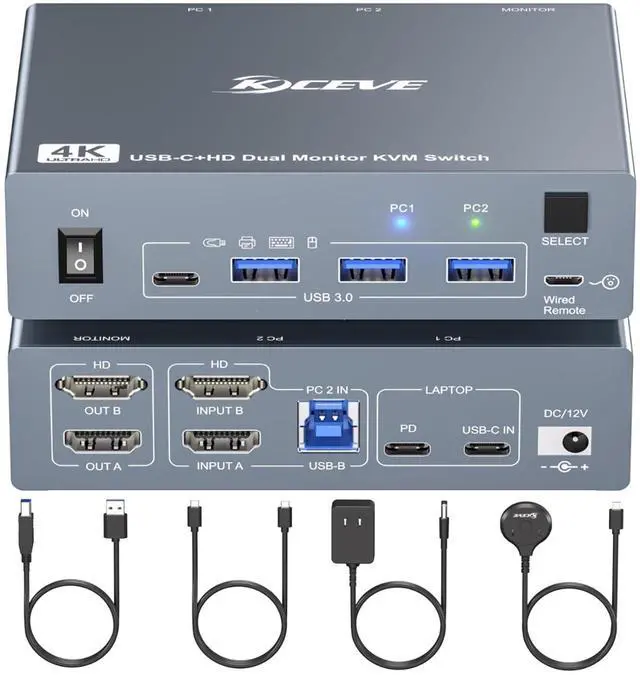 USB C HDMI Dual Monitor KVM 2 monitors KVM switch with USB-C (MST-Supported) Features 2 HDMI Inputs & 2 HDMI Outputs, share 2 monitors and 4 USB devices together.