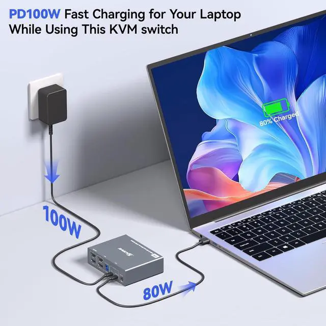 Fast Laptop Charging This USB C HDMI KVM switch comes with a PD charging port to power your laptop during use. The actual charging power is approximately 80W.