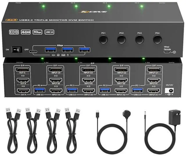 Wide Compatibility & 2 Switching Mode Plug and play,4 PC 3 monitors KVM switch driver-free for Windows, Mac, Linux, Unix, Ubuntu. You can press the button on the panel or use the wired remoteincludedto switch the computers, LED indicate the active computer.