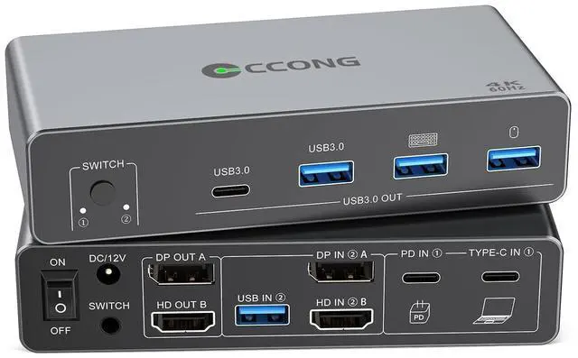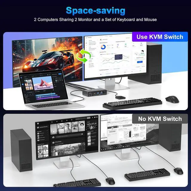 USB C KVM Switch 2 Monitors 2 ComputersThis Two monitor Two computers KVM switch revolutionizes your workflow by letting you control 2 computers effortlessly using a single keyboard and mouseall while sharing 2 monitors. No more hassle of repeatedly plugging and unplugging devices; switching between the two computers is quick and smooth. Widely compatible with major operating systems like Windows, Mac, and Linux, its designed for easy setup with true plug-and-play functionality, so you can start using it right away without complex configurations.