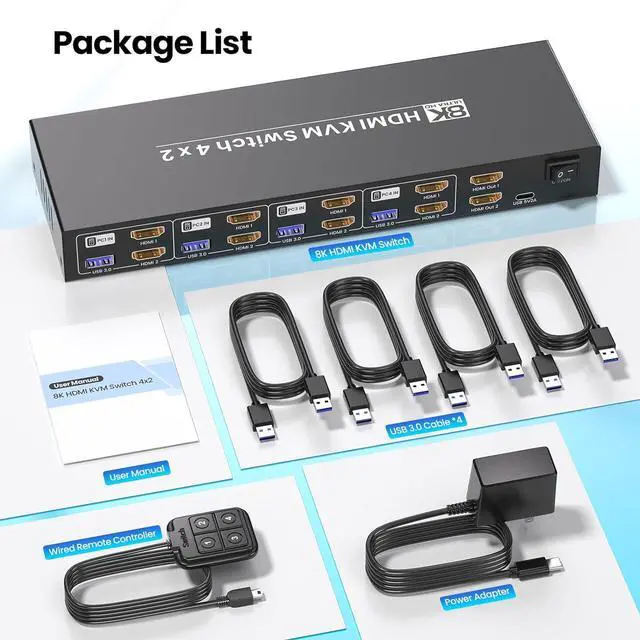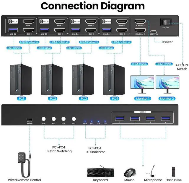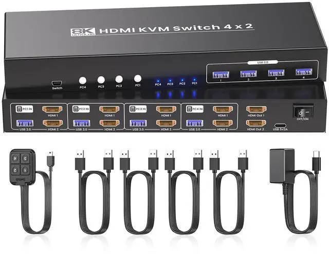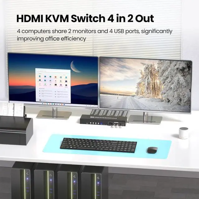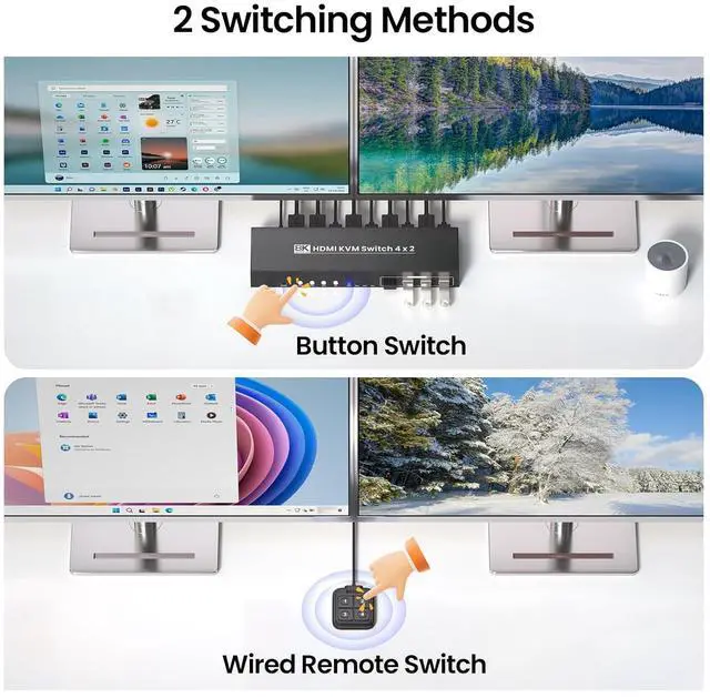 4-Port Dual Monitor HDMI KVM SwitchThis dual monitor KVM switch lets you effortlessly control and switch between four computers using just one set of peripheralsincluding a keyboard, mouse, and two monitorsso you wont need extra accessories, making it perfect for multi-device setups.