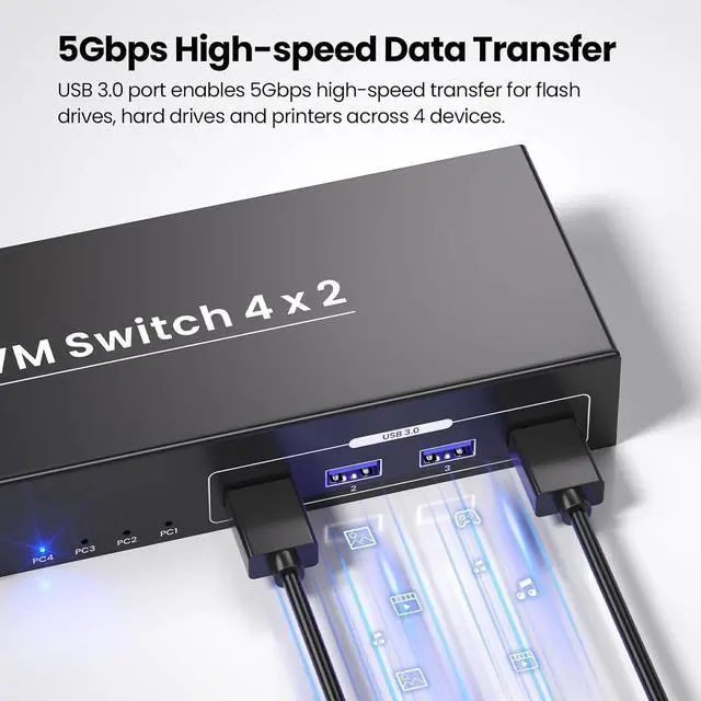 USB 3.0 High-Speed Data Transfer & Peripheral SharingThis KVM switch 2 monitors 4 computers lets you share USB peripheralslike printers, external hard drives, and webcamsacross all four connected computers. Its USB 3.0 technology ensures lightning-fast data transfer speeds, keeping all your connected USB devices running smoothly and efficiently.