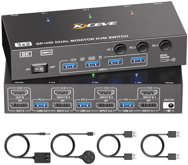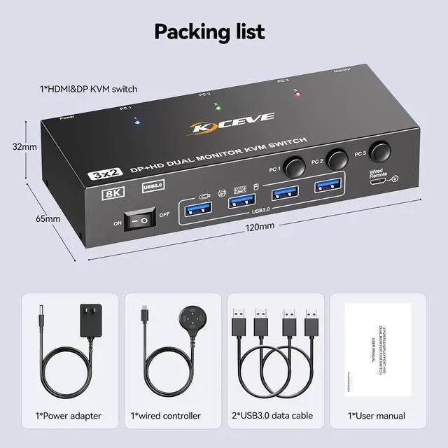 What You Will Get1*HDMI + DP Dual Monitor KVM Switch, 3*USB3.0 Cable(1.5m), 1*Wired Controller, 1*User Manual, 1*DC12V Power Adapter.