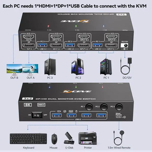 Dual Monitor KVM Switch for 3 PC This 2 monitor KVM switch allows you to control 3 computers by one set of (wired/wireless) keyboard mouse, share 2 monitors and 4 USB3.0 devices. Support Copy & Extended Mode.Copy Mode: displaying the same image at the same time. Extended Mode: Extend three different images.
