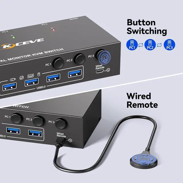 Plug and Play & 2 Switching ModeUSB3.0 KVM switch 3 Computers driver-free and plug and play.You can press the button on the panel or use the wired remoteincludedto switch the computers, LED indicate the active computer.