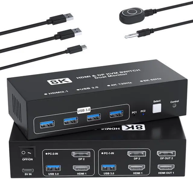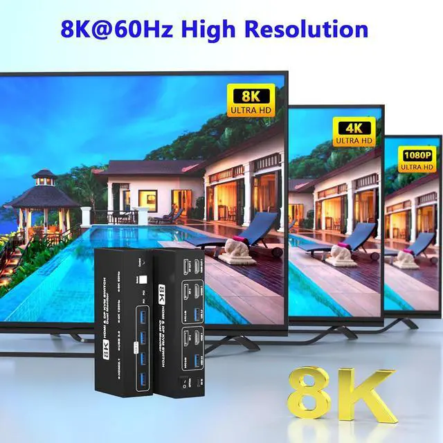 Ultra HD 8K@60Hz dual monitor KVM switches supports up to 8K@60Hz and 4K@120Hz visual experience and is backward compatible with 2K@144Hz, 1080P, etc.No signal degradation or delays. It also support extend mode and mirror mode. Plug & play without any software installation or driver. (Note:To achieve the highest resolution, you must ensure that both the source and the monitor, as well as the HDMI and DP cable support 8K@60Hz)