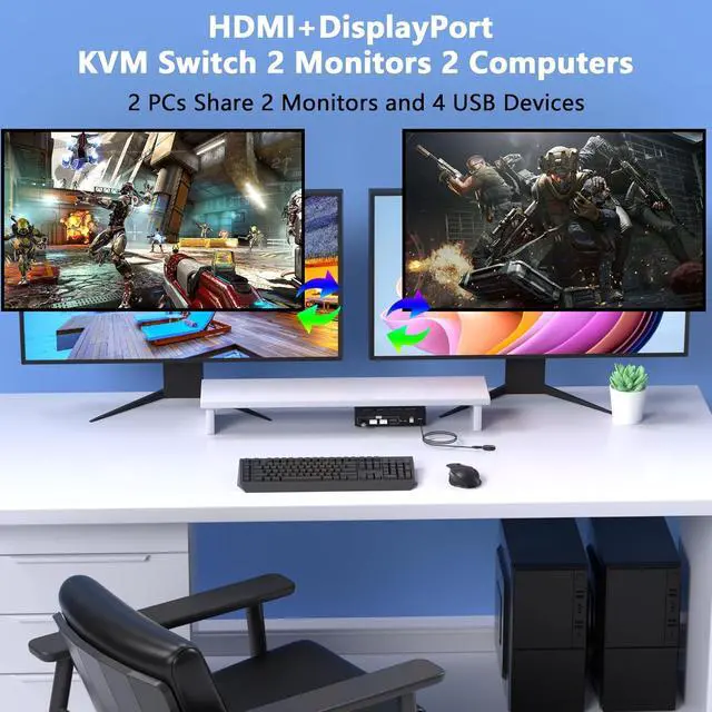 HDMIDisplayport KVM Switch 2 Monitor 2 ComputersThe HDMI Displayport KVM switch allows two computers to share two monitors and 4 USB devices. Its compatible with laptops and desktop computers, you can easily switch between them with the press of a button. LED lights clearly show which computer is active.Important NotesPlease make sure each of your computers have DP port, HDMI port and USB-A port. Docking station and additional adapter cables are not supported.