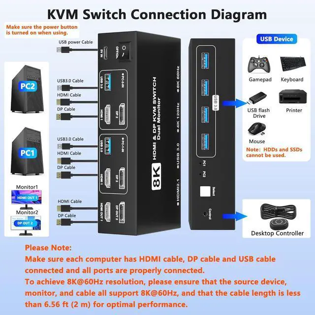 Important & Packing List1, Please make sure each of your computers can support dual-screen displaying at the same time. 2, Please make sure each of your computer has 1 HDMI ports+1Displayport+1 USB-A port. 3, Each computer must connect 1 HDMI cables + 1 Displayport cables+1 USB-A cable to ensure working properly. 4, The two monitors can only output the video source from one computer, and cannot output the signal source of PC1 and PC2 at the same time. 5, To ensure normal usage, please connect the USB power cable before use. Package List:1xKVM switch, 2xUSB3.0 Cables, 1xUSB Power Cable,1xDesktop Controller, 1xUser Manual. Please noteHDMI and DP cable is not included in the package.