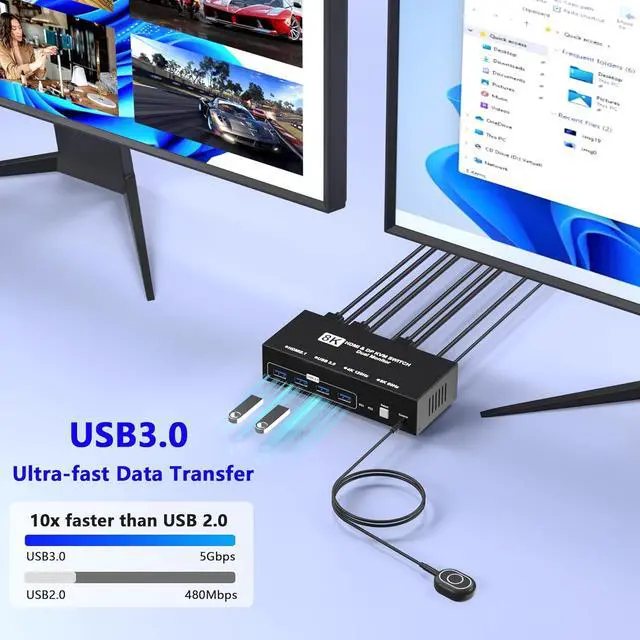 4 High-Speed USB 3.0 PortsIn addition to being compatible with two computers and two monitors, this KVM switch also has four USB 3.0 ports. All four ports can be used simultaneously, offering a fast data transfer rate of up to 5Gbps. Easily connect peripherals like keyboards, mice, printers, scanners, mobile hard drives, USB drives, and other USB devices while ensuring efficient performance.