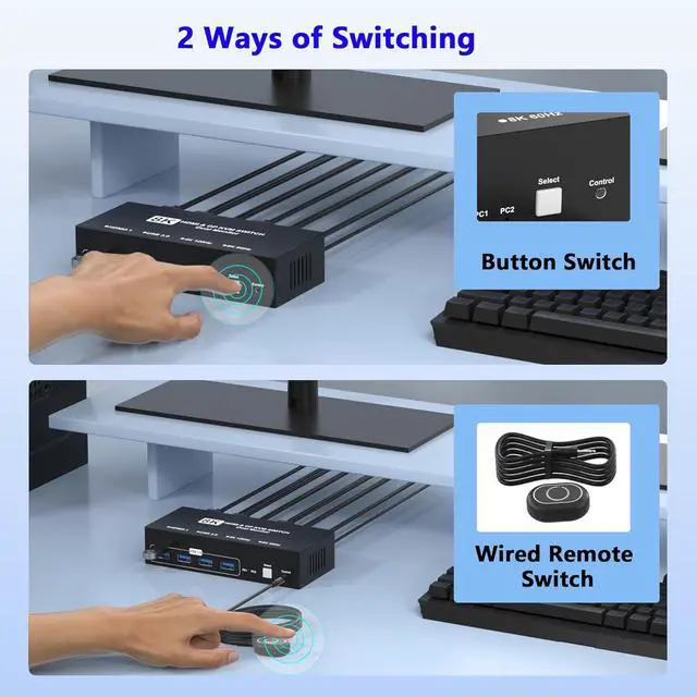 Two Ways of SwitchingThis monitor switch for 2 computers features a physical button on the main unit, allowing you to easily toggle between two connected PCs with a simple press. In addition to the built-in button on the switch, this HDMI KVM switches two computers one monitor switch comes with a desktop controller, allowing you to quickly and conveniently switch between two computers without needing to reach for the main unit. Please Note: This product does not support hotkey switching.