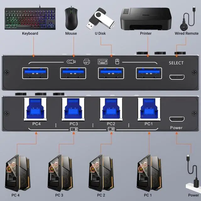 USB 3.0 Switch Selector, USB Sharing Switch 4 in 4 Out USB Switcher 4 Computers Share 4 USB Device for Keyboard, Mouse, Printer,Not supported KVM Switch 4 Monitors 4 Computers 8K@60Hz 4K@144Hz,