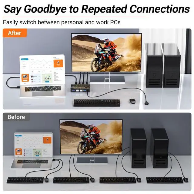 Supports 2 switching modesThe USB switch selector supports button switching and wired control switching. You can switch directly by pressing the button at the device, which is convenient and fast. You can hide the switch and use a wireless wired control to switch it, which makes your desktop clean and tidy, avoiding messy bare cable leaks. Choose any way you want.Note: not supported. Hot key switching