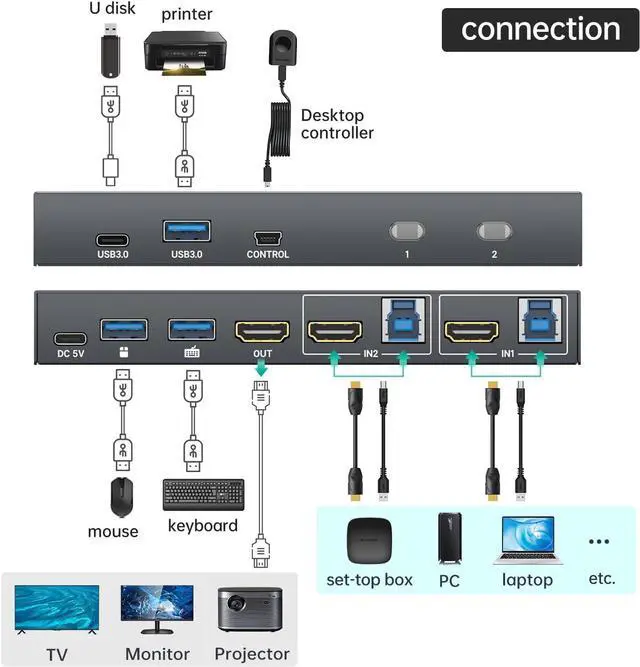 With 4 USB 3.0 Ports: This HDMI KVM switch has 3 USB 3.0 ports and 1 USB-C port for sharing USB flash drives, printers, mobile hard drives, U disk, and other USB 2.0 and USB 3.0 devices.