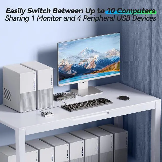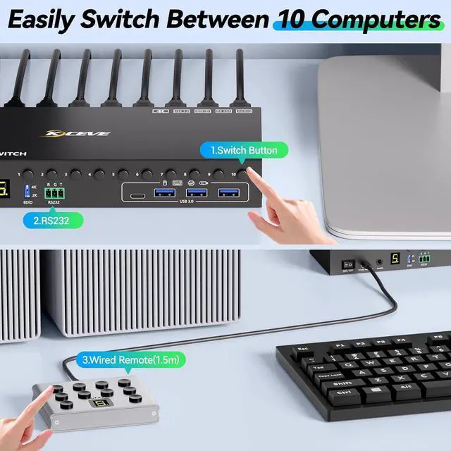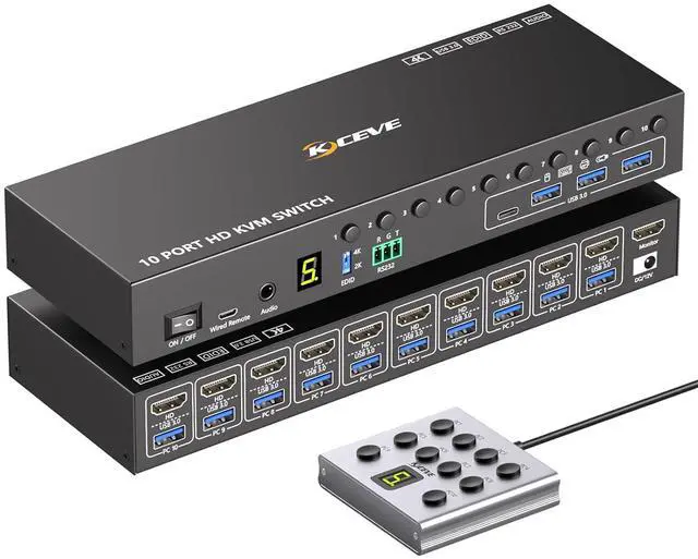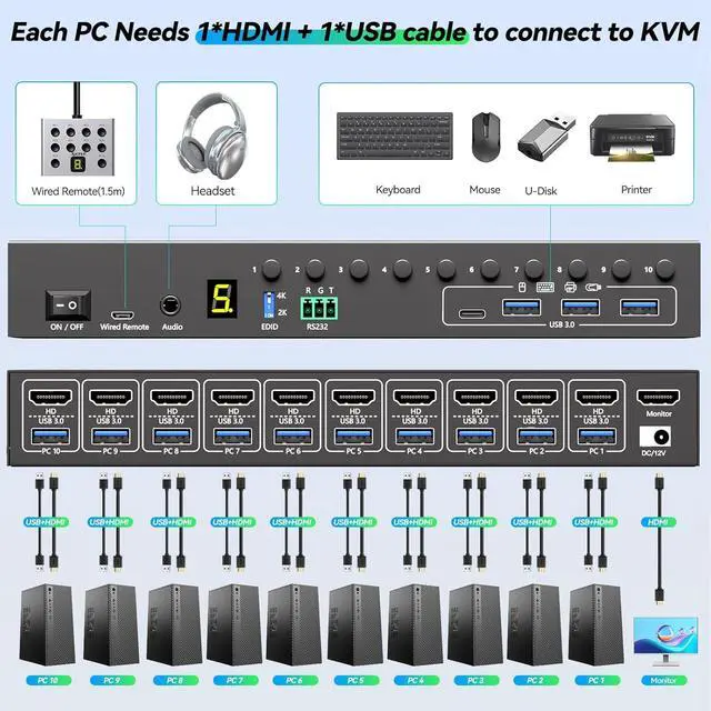 10 Port HDMI KVM SwitchThis 10 ports KVM switch can control up to 10 computers to share 1 monitor with 1 set of Wired or Wireless keyboard mouse. You can easily switch by panel button,wired remote(included) or RS232 between 10 computers on 1 monitor and share 4 USB 3.0 devices.