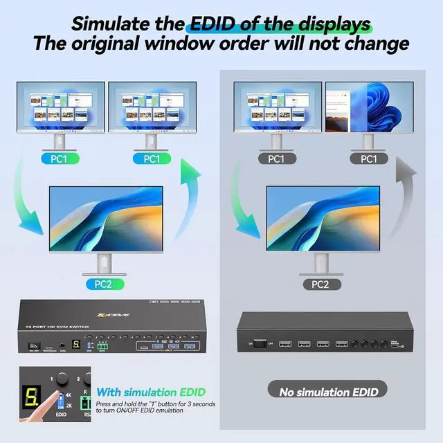 KVM Switch with EDID simulationANGEET 10 port KVM switch , store the resolution and refresh rate of the display, and when the monitor is switched between 10 computers, the original window position will not be changed, while other KVM require the user to rearrange the window order.