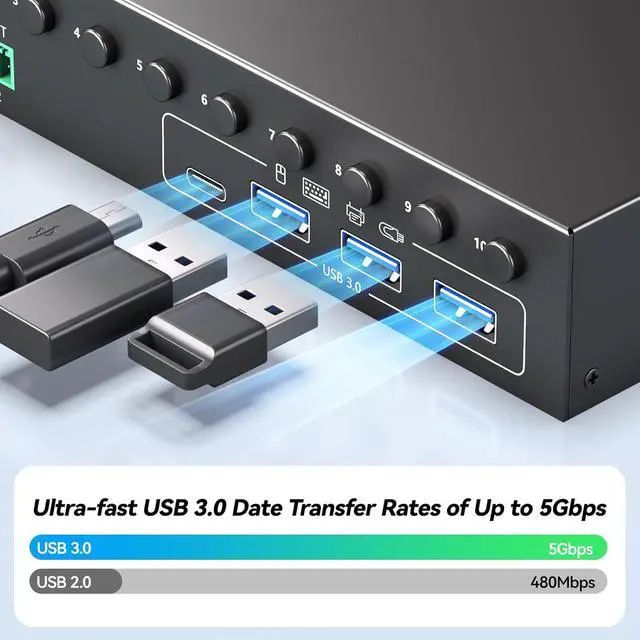KVM Switch HDMI with 4 USB 3.0 PortsHDMI USB switch with 4 USB 3.0 ports for sharing keybaord, mouse, printer, U disk and more other USB devices.Supports ultra-fast USB 3.0 data transfer up to 5Gbps,10 times faster than USB2.0, transfer files in seconds.
