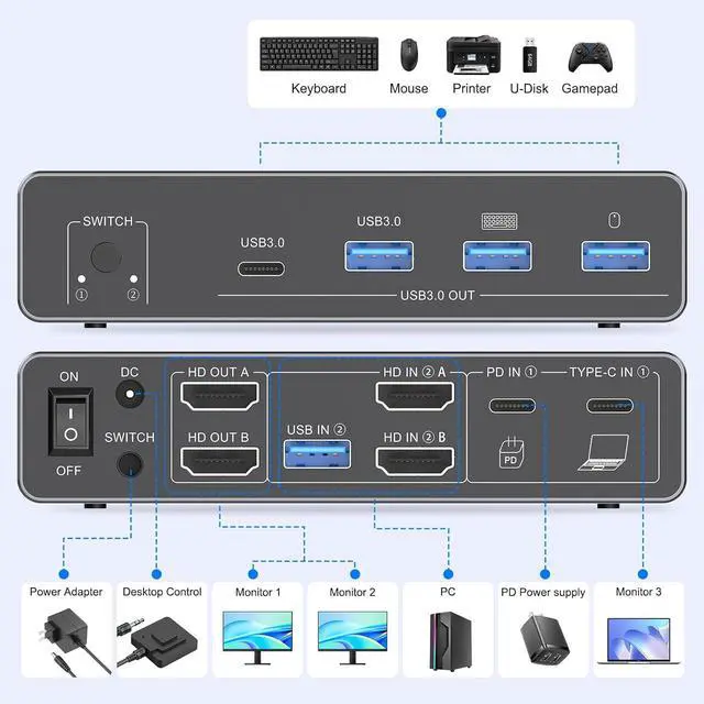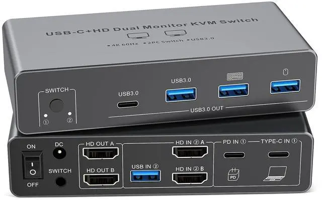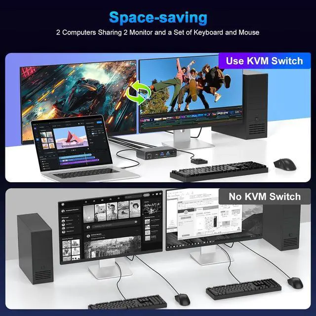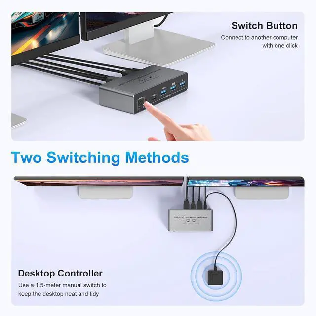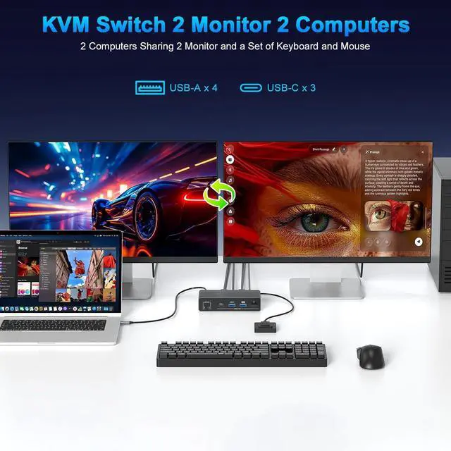 USB-C KVM Switch 2 Monitors 2 ComputersThis Two monitor Two computers KVM switch revolutionizes your workflow by letting you control 2 computers effortlessly using a single keyboard and mouseall while sharing 2 monitors. No more hassle of repeatedly plugging and unplugging devices; switching between the two computers is quick and smooth. Widely compatible with major operating systems like Windows, Mac, and Linux, its designed for easy setup with true plug-and-play functionality, so you can start using it right away without complex configurations.