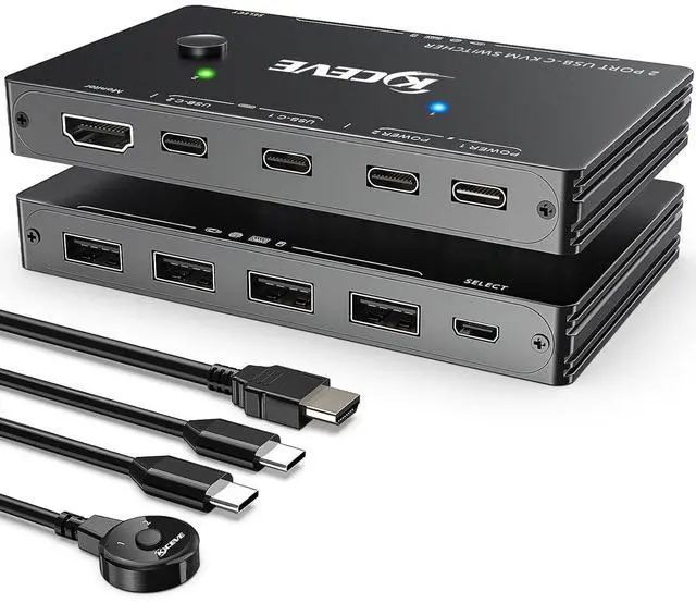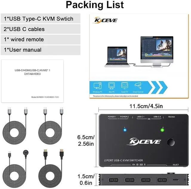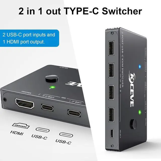 • USB-C to HDMIThis laptop USB C KVM switch allows you to connect 2 USB-C ports computers to share mouse, keybaord and monitor. Designed for those user who has 2 TYPE-C ports computers and 1 HDMI port monitor. Please use the typec-c cable replacement support data transfer, if the cable only support charging, monitor will not show image.