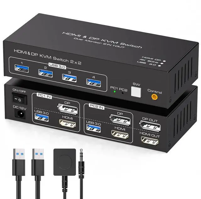 Two Switching WayThe displayport hdmi kvm dual monitor supports panel button and external wire controller switching.Using the wired extension button, you can place the KVM outside the work area, making your desktop cleaner and tidier.Or just press the panel button next to the indicator light to achieve one-click switching,Let you can save more time to do other things!NOTE: Keyboard shortcuts (hotkeys) toggles are not supported
