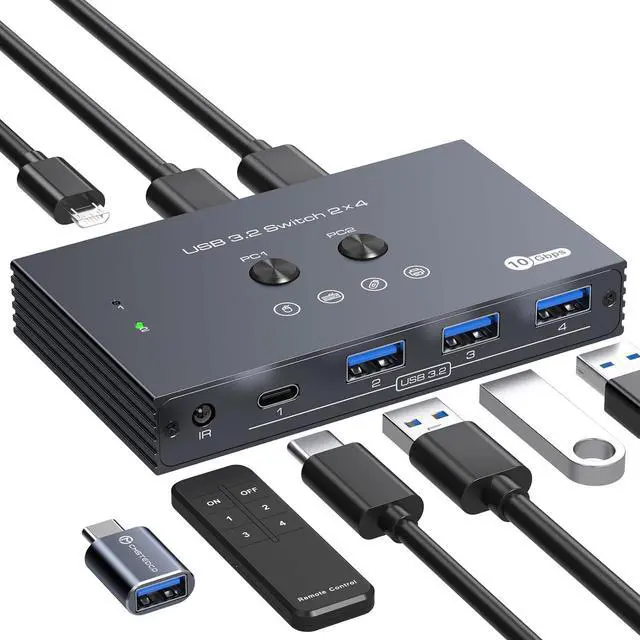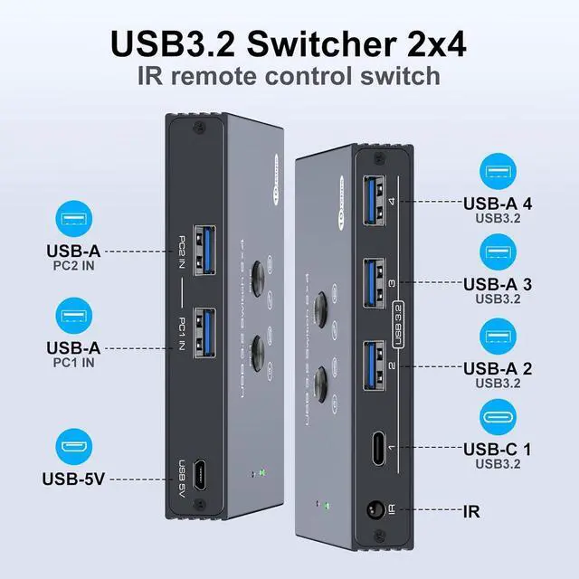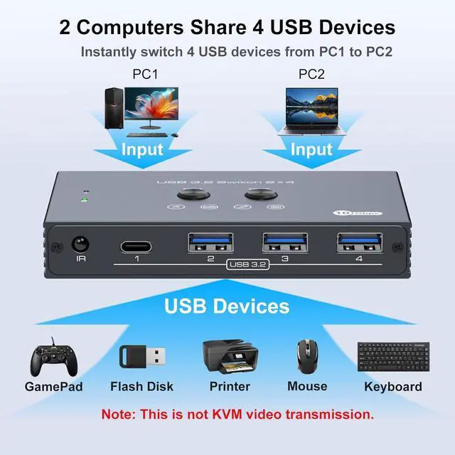 USB 3.2 Switch for Two PCs Sharing Devices: This usb 3.2 switch allows usb switcher 2 computers to share up to four USB devices easily. Provides a usb kvm switch solution for office or home setups where two PCs need access to the same keyboard, mouse, USB hub, or printer without constantly unplugging cables