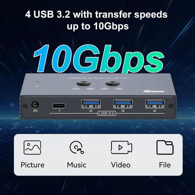 10 Gbps Data Transfer: The usb switcher features four USB 3.2 ports with data transfer speeds up to 10Gbps, providing stable performance for high-speed devices such as external hard drives, cameras, flash drives, and scanners. Supports efficient multi-computer workflows with keyboard mouse switch functionality