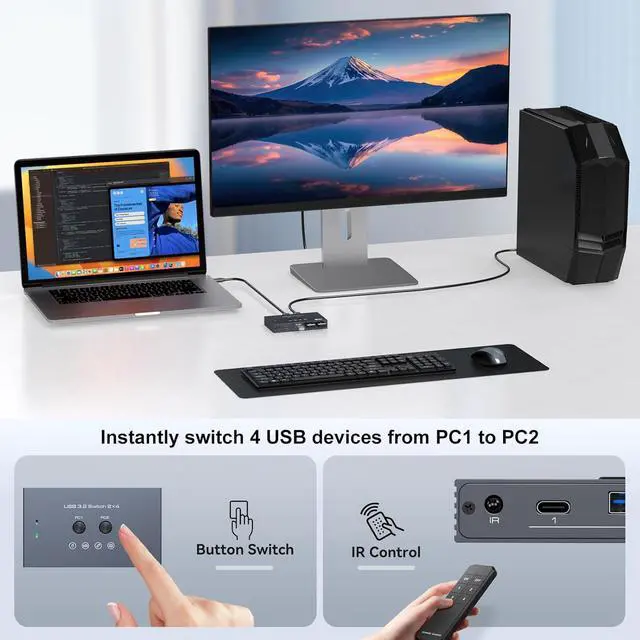 IR Remote & One-Button Switching: Switch devices between systems instantly using the top panel button or the included IR remote. This usb kvm switch makes it easy to control usb switcher 2 computers from your desk, letting you change keyboard and mouse control in seconds