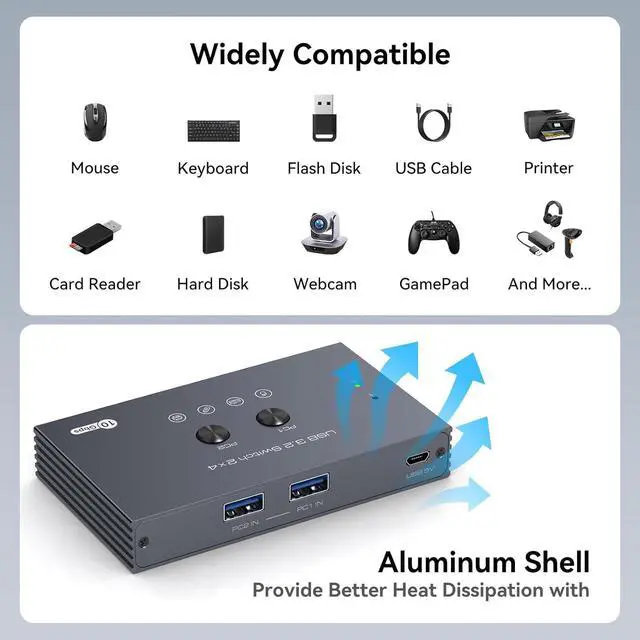 Wide Compatibility: The usb 3.2 switch supports a wide range of USB peripherals including keyboards, mice, printers, scanners, USB flash drives, cameras, and external drives. This versatile usb switcher works as a keyboard mouse switch for home office, workstation, or studio setups